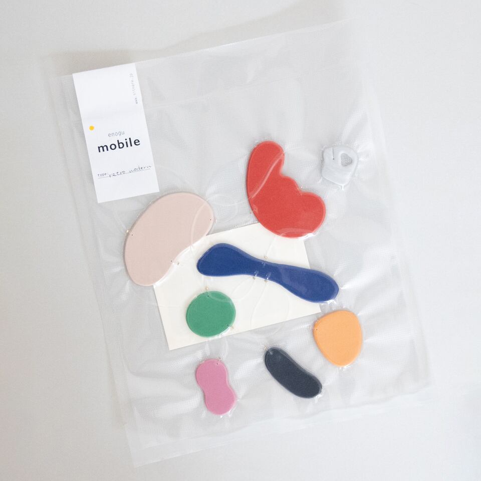 コレクション「enogu」は、焼成するとプラスチックになるという性質を持ったクレイを使い、実際にえのぐで描いた図案の色と形を半立体に表現することで作品へと昇華するシリーズです。パーツそれぞれの色は全て一つひとつ、赤や青、黄色などのクレイを混色して1から生み出しています。
