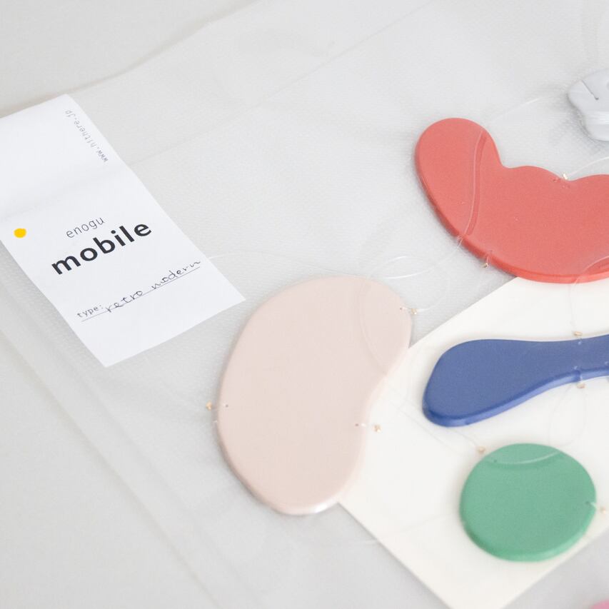 モビールから着想を得たアクセサリーシリーズから、まるで絵具で描いた形がそのまま空間に浮かんでいるようなモビールが出来上がりました。